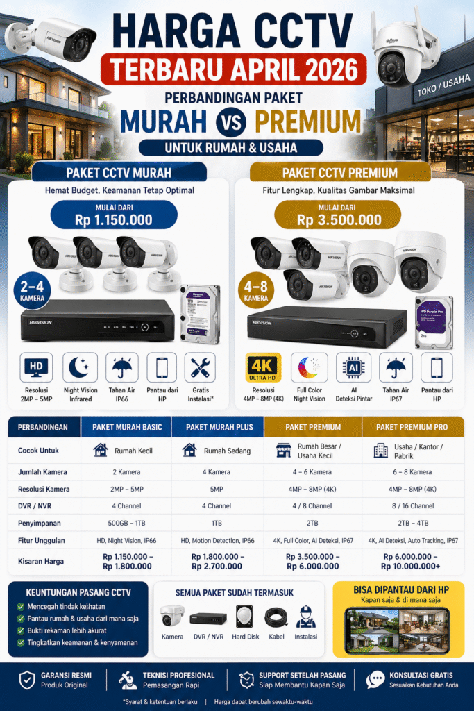 Mengetahui harga CCTV terbaru April 2026 sangat penting sebelum Anda memutuskan untuk membeli sistem keamanan. Saat ini, tersedia berbagai pilihan paket CCTV mulai dari harga murah hingga premium yang bisa disesuaikan dengan kebutuhan rumah maupun usaha. Paket CCTV murah biasanya menjadi pilihan bagi pengguna rumahan dengan kebutuhan standar. Harga paket ini umumnya mulai dari 1 […]
